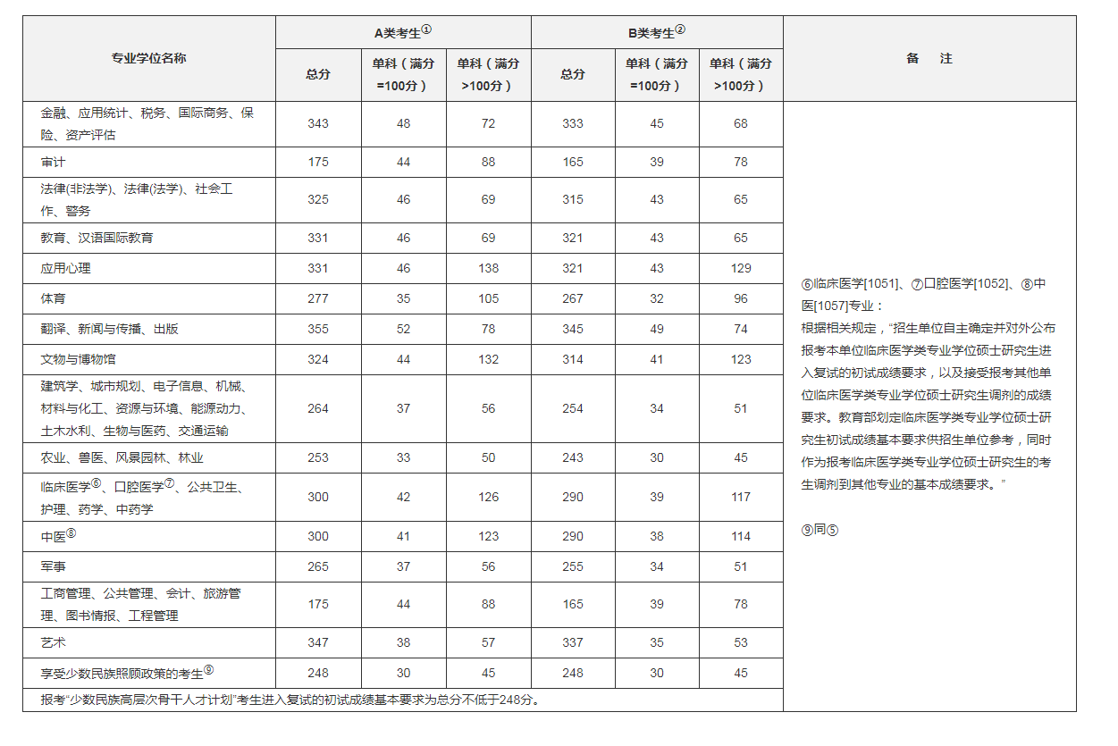 2020年全国硕士研究生招生考试考生进入复试的初试成绩基本要求(专业学位类)